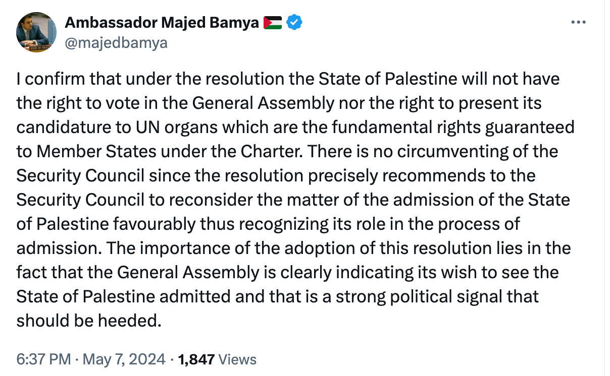 What the resolution does not—and cannot—do is give the State of Palestine the full voting rights of a member state. The Deputy Palestinian Representative to the UN explained this on Twitter earlier this week.
